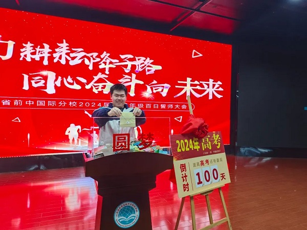 省前中国际分校党支部书记、校长王俊涛与童文杰副校长共同为冲刺高考倒计时100天举行揭牌仪式,宣告“奋战百天,迎战高考”之役正式打响!